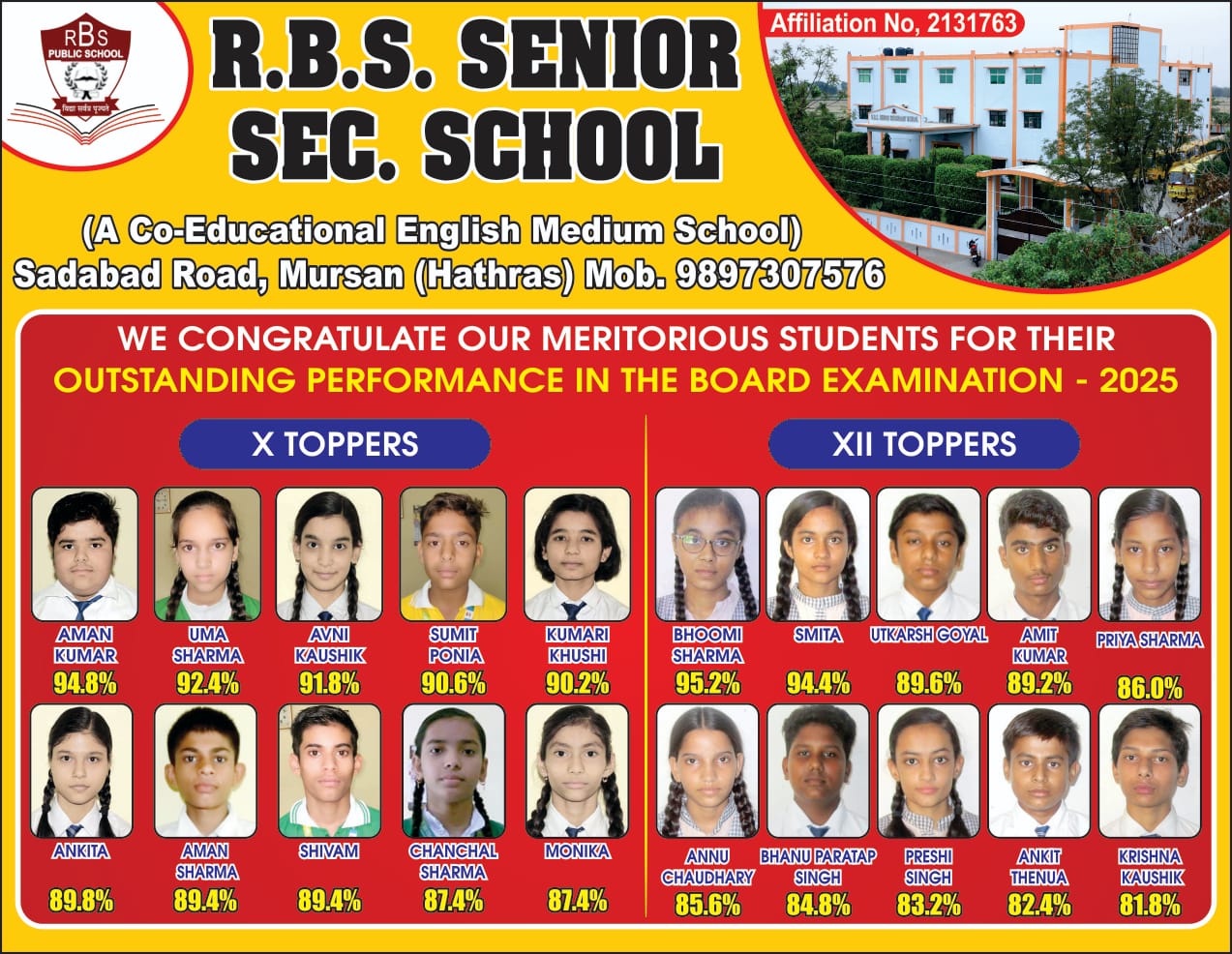 RBS PUBLIC SCHOOL, Mursan affiliated to CBSE is one of the most prestigious senior secondary school in and around Hathras District.